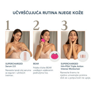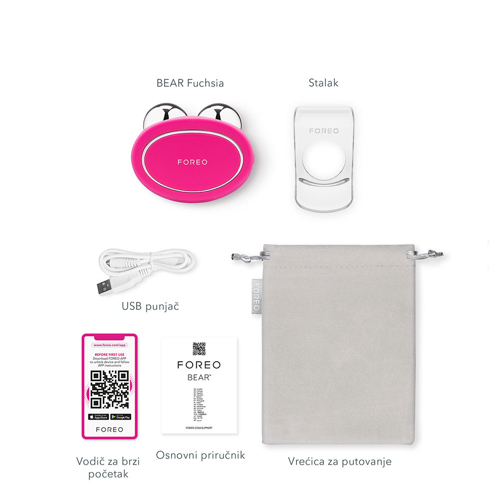 FOREO BEAR je uređaj za učvršćivanje kože lica koji koristi 5 intenziteta mikrostruje i T-Sonic pulsacije kako bi se konture lica osjetljive na utjecaj starenja podigle i učvrstile. Ovaj neinvazivni uređaj namijenjen korištenju kod kuće pridonosi smanjenju vidljivosti bora na cijelom licu, uz ciljano djelovanje na liniju čeljusti, obraze, vrat i čelo. BEAR mjeri električni otpor vaše kože, a ugrađeni Anti-Shock System prilagođava mikrostruju unutar izabranog intenziteta za maksimalnu sigurnost i ugodu. Ovaj punjivi uređaj prikladan je za svaki tip i starost kože te se mora upotrebljavati uz provodljivi FOREO serum za sigurno korištenje te vidljive i dugotrajne rezultate.