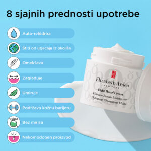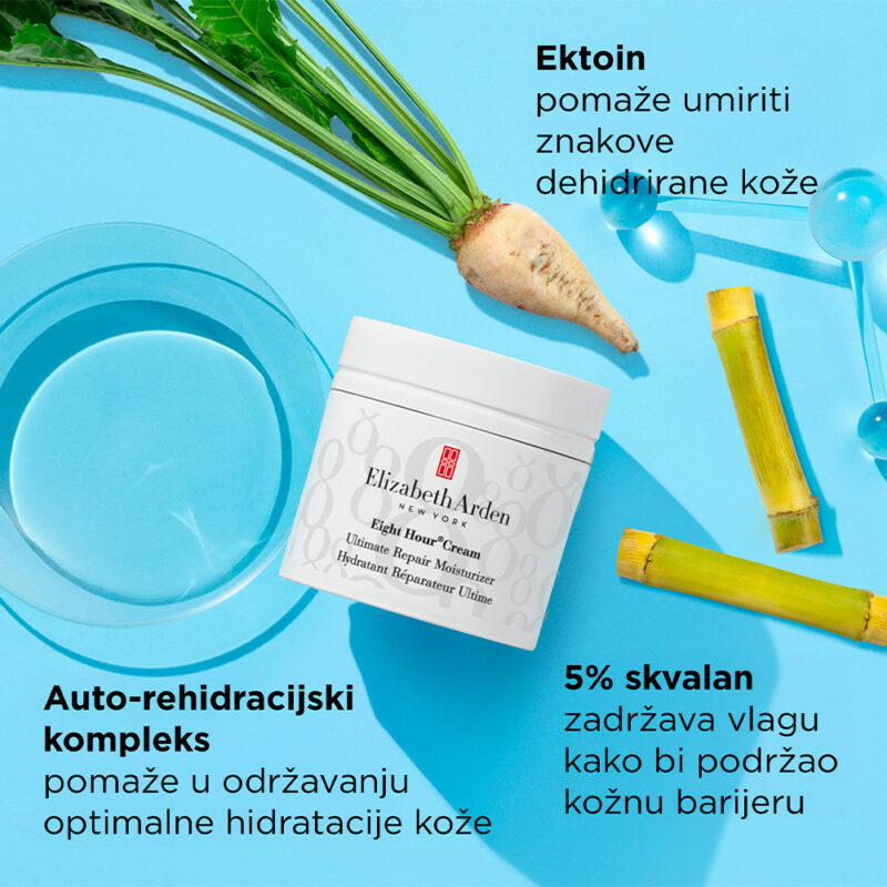 Eight Hour Ultimate Repair Moisturizer – Lagana dnevna krema s naprednim Auto-Rehydrating kompleksom koja ne samo da vlaži, već uči vašu kožu kako da se sama obnavlja. Pruža nevjerojatnih 80 sati postojane hidratacije, jača zaštitnu barijeru i vraća koži izgubljeni sjaj.