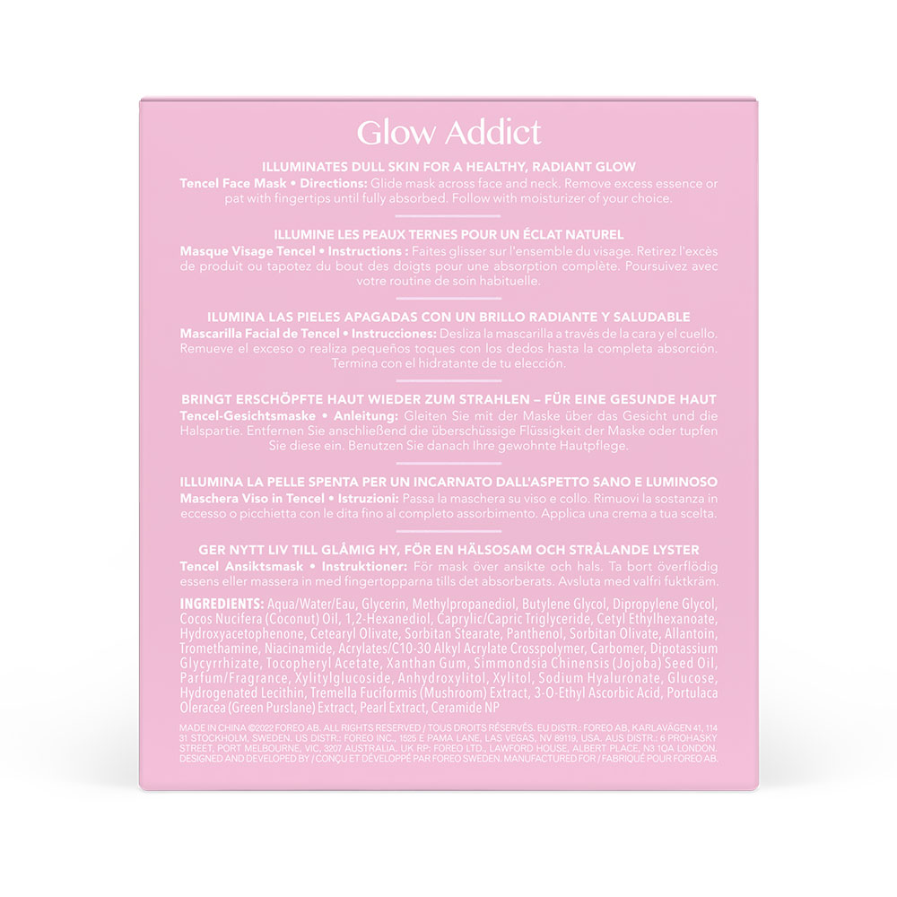Uživajte u brzom rješenju od 90 sekundi za trenutno brisanje umora i vraćanje mladenačkog sjaja s laganom, poluprozirnom, glatkom i mliječnom formulom. Klinički dokazano pruža duboku vlažnost do 8 sati, maska za ljepotu Glow Addict 2.0 vidljivo regenerira beživotnu kožu, dok lebdite s mirisom aromatične mješavine svježeg zelenila, zračno laganih cvjetnih nota i toplih voćnih elemenata. Koncentrirana čista formula dolazi u pakiranju od 6 vrećica i kompatibilna je sa svim UFO™ uređajima.