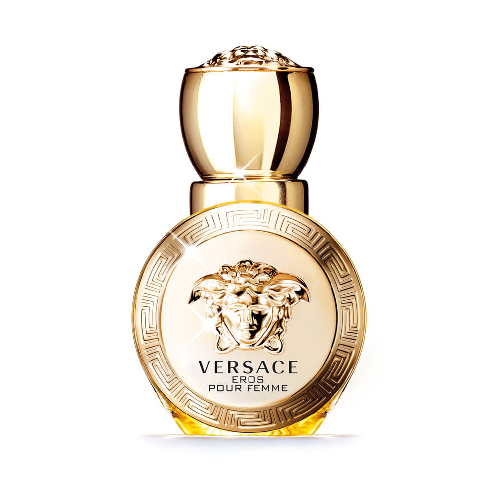 Ženski miris u glamuroznoj bočici boje zlata potpisuju – Alberto Morillas, Olivier Cresp i Nathalie Lorson koji su zajedno radili na stvaranju nove kompozicije. Kompozicija ženskog mirisa Eros Pour Femme otvara se privlačnim notama sicilijanskog limuna, kalabrijskog bergamota i nara. Cvjetovi limuna, Absolute Sambac jasmin, note jasmina i božura predstavljaju cvjetno srce mirisa. U osnovi su sandalovina, ambrox, mošus i različite senzualne drvene note. Bočica mirisa Eros Pour Femme je zaobljena i ukrašena reljefnim simbolom Meduze na centralnom djelu stakla bočice i vrhu čepa s tipičnim grčkim motivom ugraviranim po rubu. Izrađena je od stakla i ukrašena metalik zlatnim detaljima i čepom. Bočica je pakirana u deluxe kutjii visoke kvalitete koja se elegantno otvara sa strane.